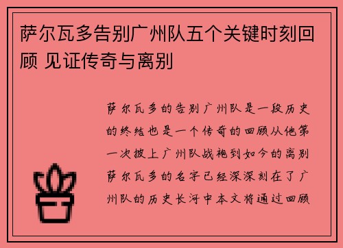 萨尔瓦多告别广州队五个关键时刻回顾 见证传奇与离别
